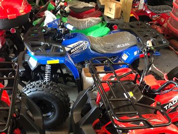 This is a new 120 CC Rival Mudhawk 10 ATV. The Mudhawk 10 comes with a four-stroke, single-cylinder, air-cooled engine with a fully automatic transmission with reverse. This ATV features a 2.3-liter tank and adjustable front and rear suspension shocks. Along with that, the Mudhawk 6 features front and rear disc brakes.