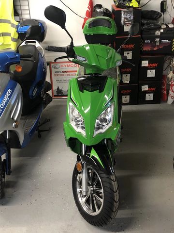 This is a new 2020 150 CC black Kymco Spade 150i Mini-Motorcycle. The transmission is five-speed. It comes with a 28-inch seat. It also comes with dual rear shocks. It is fuel-injected and ICM based. It gets 96 mpg and is capable of 60+ mph. It has a 1.6-gallon fuel tank. It also has 12-inch aluminum wheels. Comes with a two-year warranty.