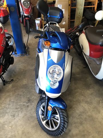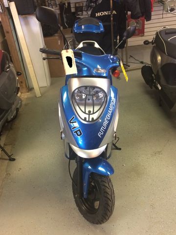 This is a new 50 CC blue, black, and silver Tao Tao VIP 50 Scooter. It has an automatic transmission with an air-cooled, single-cylinder engine. It has both electric and kick starts and has both hydraulic disk front brakes and drum rear brakes.