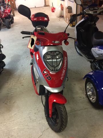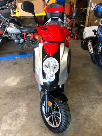 This is a new 50 CC red, black, and silver Tao Tao VIP 50 Scooter. It has an automatic transmission with an air-cooled, single-cylinder engine. It has both electric and kick starts and has both hydraulic disk front brakes and drum rear brakes.