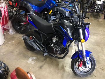 This is a new 125 CC blue and black Tao Tao Hellcat 125 Motorcycle. This motorcycle features an air-cooled, four-stroke, single-cylinder engine. It is electric start only and features a four-speed manual transmission with a clutch for shifting. The Hellcat 125 features a 1.5-gallon tank and can reach speeds of up to 47 MPH. The front and rear brakes are hydraulic disc brakes.