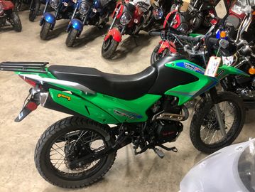 This is a new 250 CC green, blue, and black Tao Tao Enduro TBR7 Street Bike. It is street-legal, has a five-speed transmission, and gets 55 mph. It has both electric and kick starts. It has a four-stroke engine and a seat height of 34 inches.