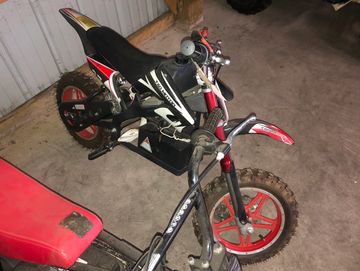 This is a used black, white, and red Tao Tao E3-350 electric Dirt Bike. This Dirt Bike is a great starter bike for starting riders who want to get a real off-road experience at a young age. The E3-350 features a 12 ampere-hour battery, hydraulic disk front and rear brakes, and full suspension, making for an enjoyable riding experience.