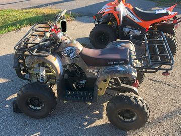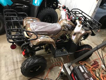 This is a used 125 CC camo, grey, and black Tao Tao D125 ATV. This redesign of the classic D125 has a new decal design along with color-matching tires, dipstick, seat, etc. The ATV features an air-cooled, four-stroke, single-cylinder engine. It is fully automatic with reverse as well. This ATV has a fuel capacity of 2.3 liters and features adjustable front and rear shocks. The front-hand brake for this ATV is a drum brake while the rear-foot brake is an hydraulic disk brake.