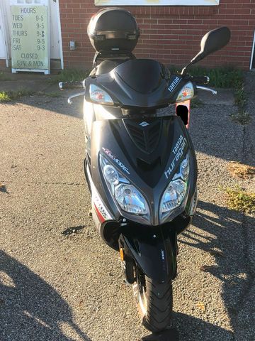 This is a used 50 CC black, grey, and white Tao Tao Huragan Classic EVO50 Scooter. This Scooter features an air-cooled, four-stroke, single-cylinder engine and a fully automatic transmission. This Scooter can reach speeds of up to 35 miles per hour and has a fuel tank capacity of 1.5 gallons. The Huragan Classic EVO50 also has front hydraulic disk brakes and rear drum brakes.