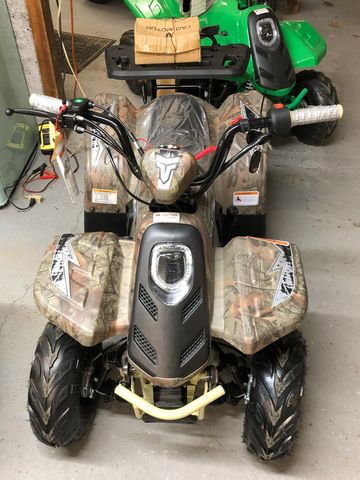 This is a new 110 CC camo and black Tao Tao Rock 110 ATV. This ATV includes all of the features for a youth ATV, including a transmission with reverse, a wireless remote shut-off, and a speed governor for limiting the top speed. The Rock 110 also features front and rear shocks, LED lights, front drum brakes, and rear disk brakes. Lastly, the Rock 110 ATV includes an air-cooled, four-stroke, single-cylinder engine, a 2.3-liter fuel tank, and a cargo rack for storage or hauling.
