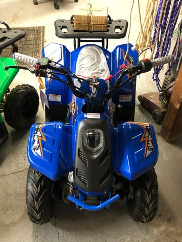 This is a new 110 CC blue, orange, grey, and black Tao Tao Rock 110 ATV. This ATV includes all of the features for a youth ATV, including a transmission with reverse, a wireless remote shut-off, and a speed governor for limiting the top speed. The Rock 110 also features front and rear shocks, LED lights, front drum brakes, and rear disk brakes. Lastly, the Rock 110 ATV includes an air-cooled, four-stroke, single-cylinder engine, a 2.3-liter fuel tank, and a cargo rack for storage or hauling.