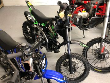 This is a new 110 CC green, black, and white Tao Tao DB-14 Dirt Bike. This Dirt Bike complements younger riders by having an easy-to-use kick start, a four-speed transmission with an automatic clutch, and a 110 CC air-cooled, single-cylinder, four-stroke engine. The lightweight frame and durable tires make this dirt bike glide across almost all terrain. The rear shocks complement your riding experience, and the front and rear hydraulic disk brakes offer a quick way to come to a complete stop.