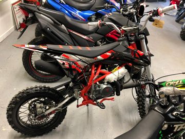 This is a new 140 CC red, grey, and black Tao Tao DB-X1 Dirt Bike. This Dirt Bike features an air-cooled, single-cylinder engine with a manual, four-speed transmission. It also features both front and rear hydraulic disk brakes. The new rear shocks can be adjusted to accommodate for most terrains to create a more enjoyable ride. Lastly, the DB-X1 features a redesigned throttle assembly with bearings for smooth operation and a 1.2-gallon fuel tank.