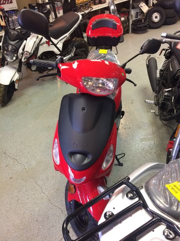 This is a new 50 CC red and black Tao Tao Pony 50 Scooter. It has an automatic transmission with an air-cooled, single-cylinder, four-stroke engine. It has both electric and kick starts and has hydraulic disk front and rear brakes.