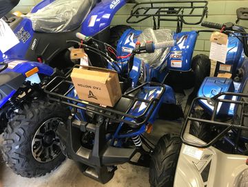 This is a new 125 CC blue, grey, and black Tao Tao T-Force ATV. This redesign of the classic T-Force has a new decal design along with color-matching tires, dipstick, seat, etc. The ATV features an air-cooled, four-stroke, single-cylinder engine. It is fully automatic with reverse as well. This ATV has a fuel capacity of 2.3 liters and features adjustable front and rear shocks. The front-hand brake for this ATV is a drum brake while the rear-foot brake is an hydraulic disk brake.