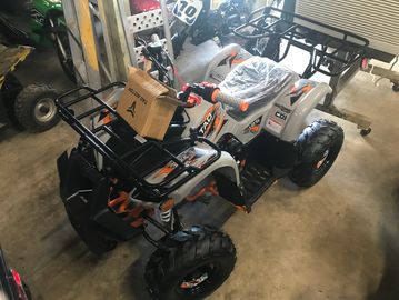 This is a new 125 CC grey, orange, and black Tao Tao T-Force ATV. This redesign of the classic T-Force has a new decal design along with color-matching tires, dipstick, seat, etc. The ATV features an air-cooled, four-stroke, single-cylinder engine. It is fully automatic with reverse as well. This ATV has a fuel capacity of 2.3 liters and features adjustable front and rear shocks. The front-hand brake for this ATV is a drum brake while the rear-foot brake is a hydraulic disk brake.