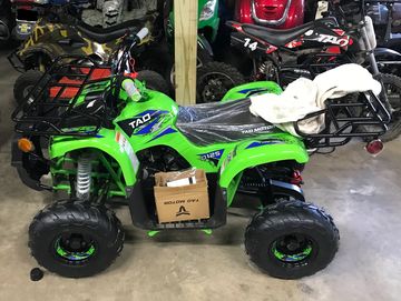 This is a new 110 CC green and black Tao Tao Rock 110 ATV. This ATV includes all of the features for a youth ATV, including a transmission with reverse, a wireless remote shut-off, and a speed governor for limiting the top speed. The Rock 110 also features front and rear shocks, LED lights, front drum brakes, and rear disk brakes. Lastly, the Rock 110 ATV includes an air-cooled, four-stroke, single-cylinder engine, a 2.3-liter fuel tank, and a cargo rack for storage or hauling.