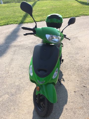 This is a new 50 CC green and black Tao Tao Pony 50 Scooter. It has an automatic transmission with an air-cooled, single-cylinder, four-stroke engine. It has both electric and kick starts and has hydraulic disk front and rear brakes.
