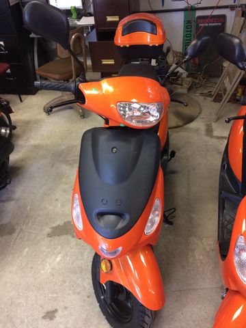 This is a new 50 CC orange and black Tao Tao Pony 50 Scooter. It has an automatic transmission with an air-cooled, single-cylinder, four-stroke engine. It has both electric and kick starts and has hydraulic disk front and rear brakes.