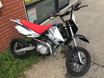 This is a new 110 CC red, white, and black Tao Tao DB-10 Dirt Bike. The DB-10 features an air-cooled, four-stroke, single-cylinder engine with an automatic transmission. Its 6.4 Horsepower allows this Dirt Bike to reach speeds of up to 30 MPH. This Dirt Bike also features electric start only and front hydraulic disk brakes and drum rear brakes.