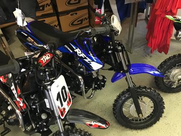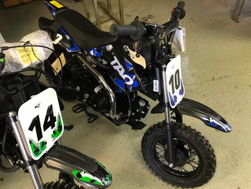 This is a new 110 CC blue, white, and black Tao Tao DB-10 Dirt Bike. The DB-10 features an air-cooled, four-stroke, single-cylinder engine with an automatic transmission. Its 6.4 Horsepower allows this Dirt Bike to reach speeds of up to 30 MPH. This Dirt Bike also features electric start only and front hydraulic disk brakes and drum rear brakes.