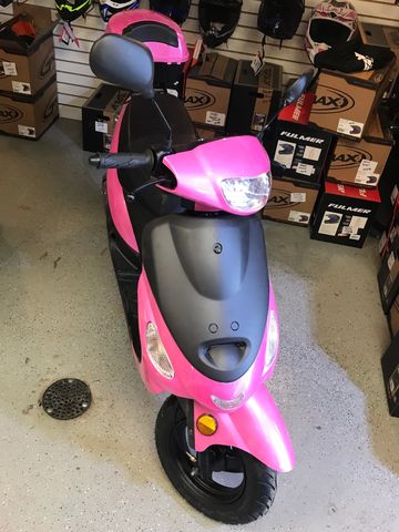 This is a new 50 CC pink and black Tao Tao Pony 50 Scooter. It has an automatic transmission with an air-cooled, single-cylinder, four-stroke engine. It has both electric and kick starts and has hydraulic disk front and rear brakes.